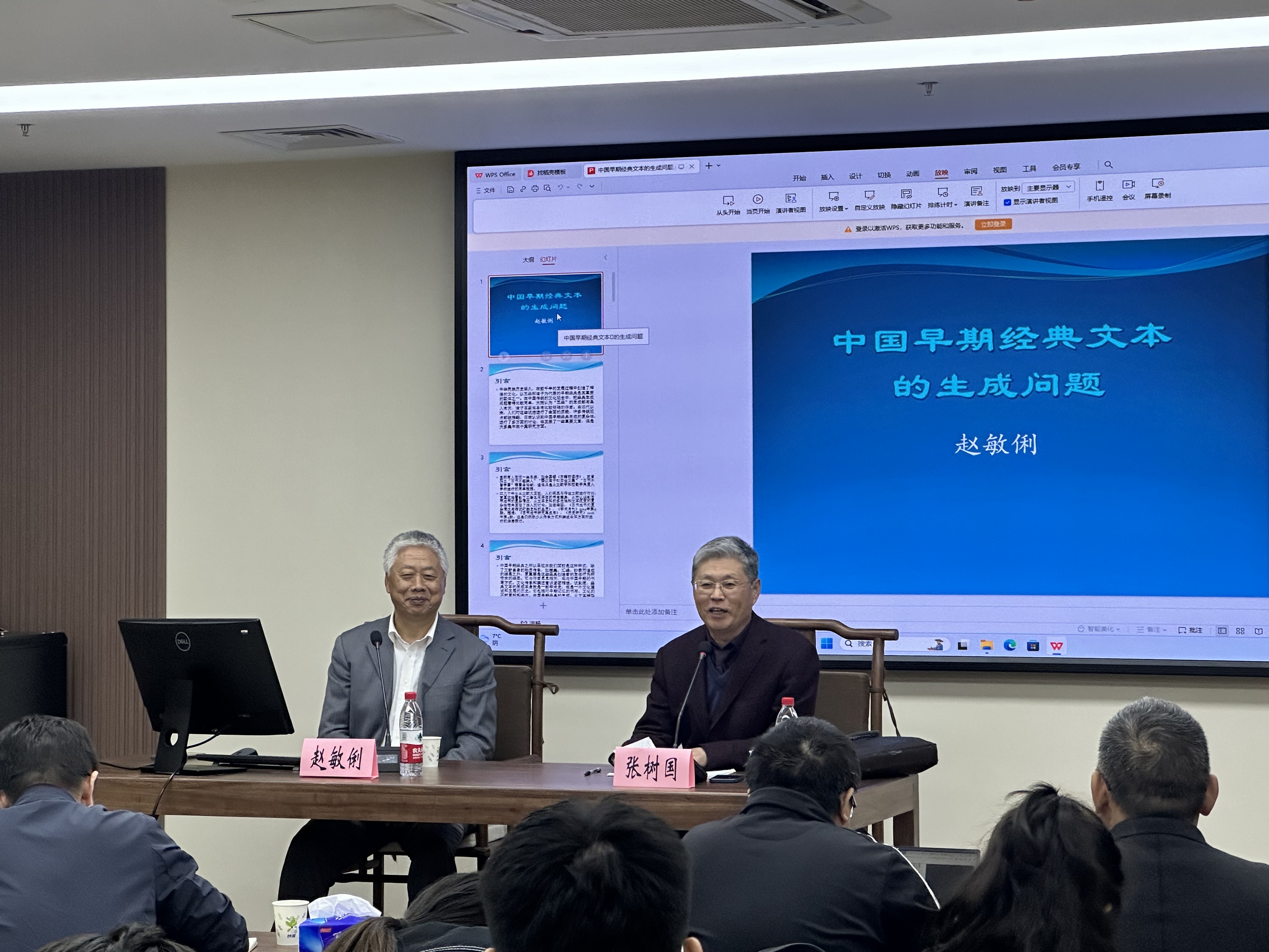 2023年11月13日晚,小黄书 太炎讲堂系列讲座在恕园23号楼314会议室召开,中国乐府学会会长、首都师范大学燕京人文讲席教授赵敏俐教授受邀作题为“中国早期经典的文本生成问题”的讲座。本次讲座由小黄书 中文系张树国教授担任主持人,一同出席讲座的还有小黄书 刘正平教授、王晶波教授、姜荣刚教授、陈学祖副教授、谷玲玲助理研究员,以及众多孳孳向学的本、硕同窗。