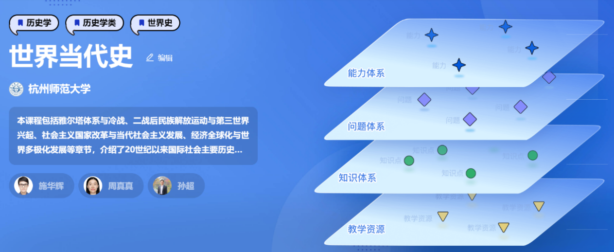 该知识图谱课程由施华辉、周真真、孙超三位老师合作建设完成。课程内容包括雅尔塔体系与冷战、二战后的民族解放运动与第三世界兴起、社会主义国家改革与当代社会主义发展、经济全球化与世界多极化发展等,涵盖了去殖民化过程、世界社会经济发展趋势、国际关系变迁等主题。
