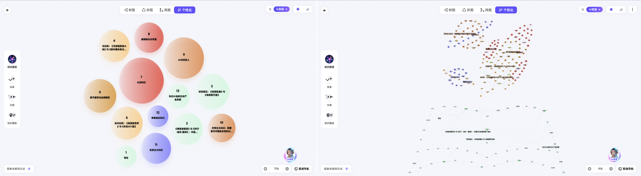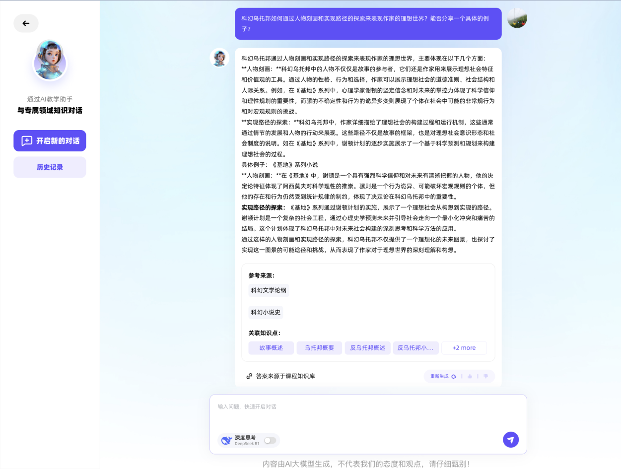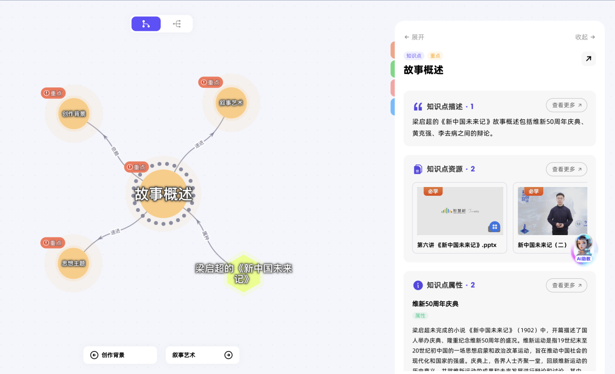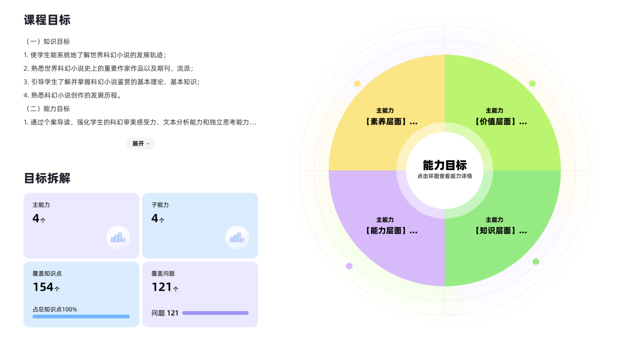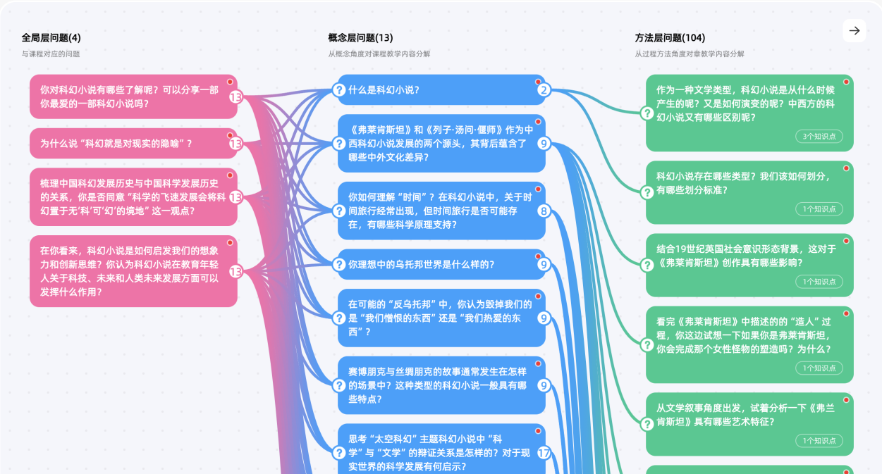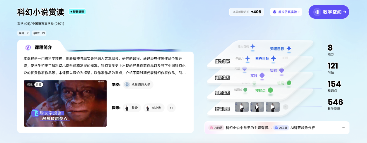 学院建设有历史专业6门、中文专业12门,共计18门智慧课程(5门课程建设中)。智慧课程通过深度融合课程数字化资源、知识图谱与人工智能技术三要素,构建了体系化、结构化、可视化的知识框架,助力学生系统掌握课程的核心知识点。以《科幻小说赏读》为例,课程详细梳理了154个关键知识点,挂载了546个相关资源;在丰富教学内容的同时,构建以问题和能力为导向的图谱体系,包含121个深入探讨的问题以及8项核心能力的培养目标,实现从理论知识到实际能力的有效转化,使得教学过程更加精准高效。