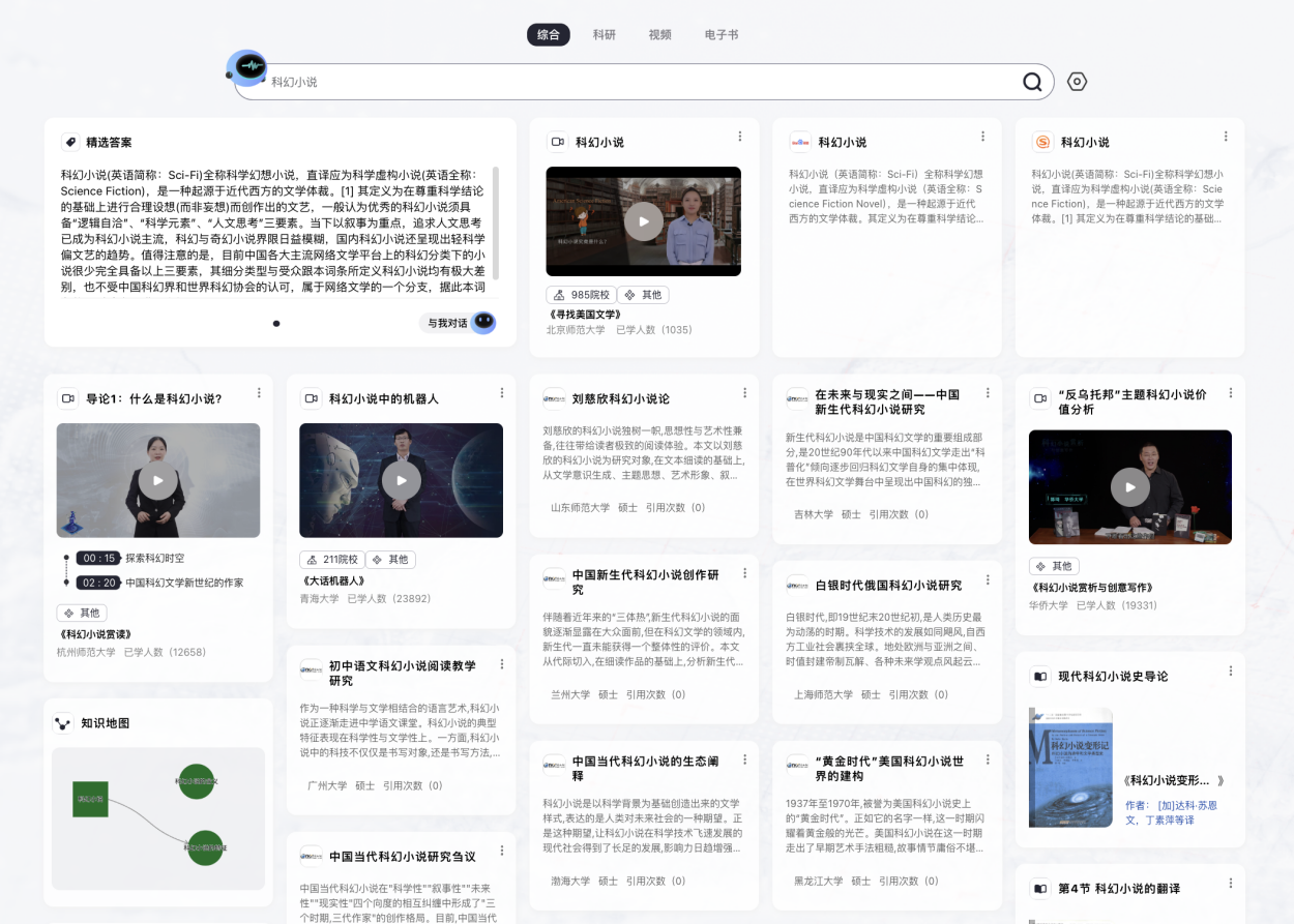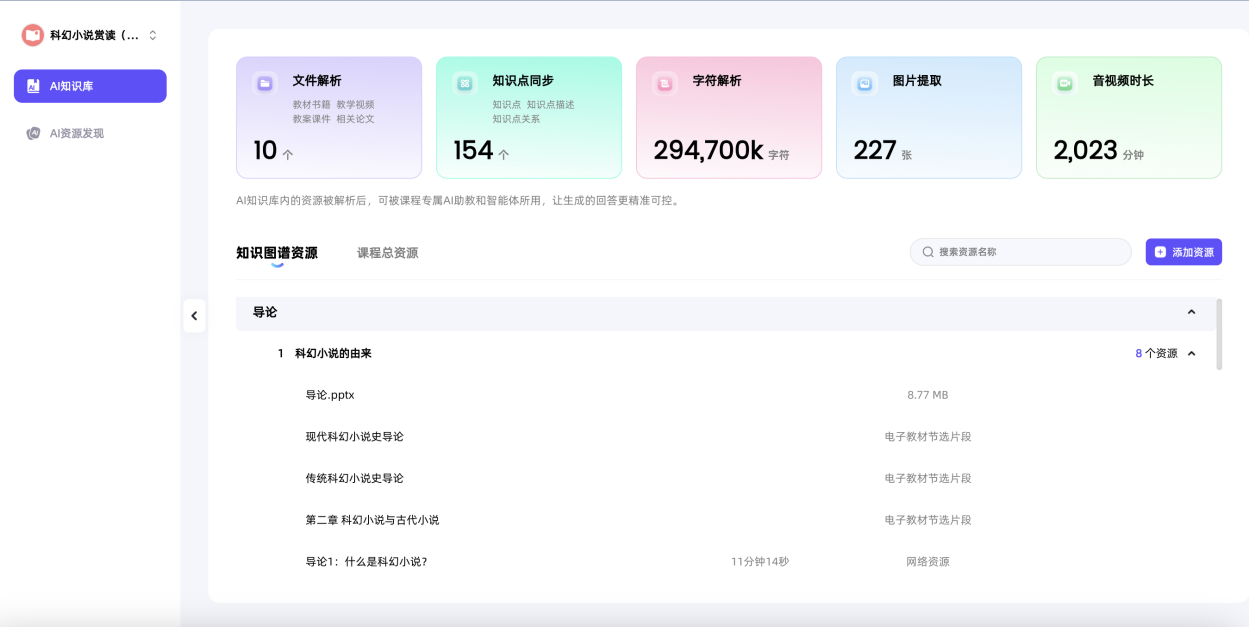 AI技术融入教学全过程,支撑课程教学全场景;人工智能技术与教育教学深度融合,AI资源发现根据搜索的知识点智能推荐优质资源,包括视频、电子书、科研论文等多模态资源,并对资源进行分析、拆解、切片,标记出各个关联知识点的内容,AI推荐适合的学习内容,加快学生查漏补缺的速度,避免重复学习。