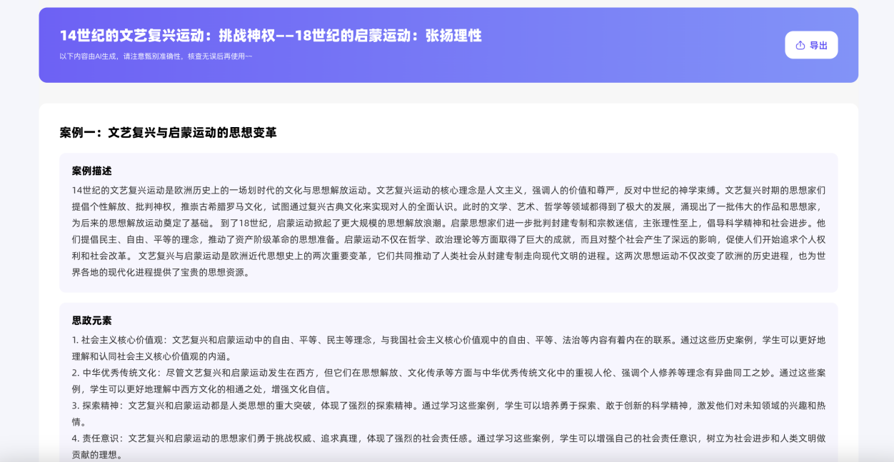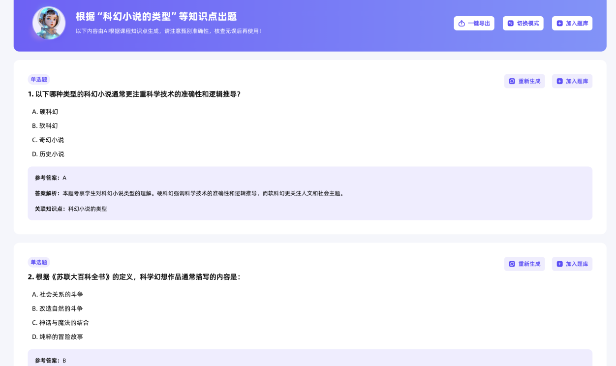同时配备AI生成课程思政案例、AI生成场景问题、AI知识点自动出题、AI生成试卷等AI功能应用于课程建设、教师备课、课堂教学、线上应用等维度。