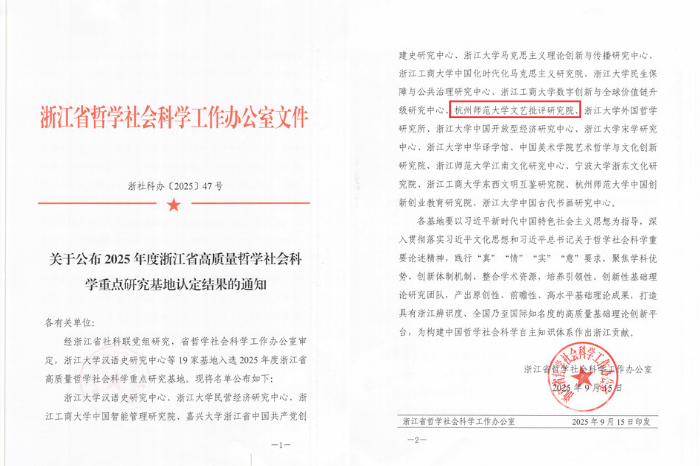 近日,浙江省哲学社会科学工作办公室发布《关于公布2025年度浙江省高质量哲学社会科学重点研究基地认定结果的通知》(浙社科办〔2025〕47号),杭州师范大学文艺批评研究院入选2025年度浙江省高质量哲学社会科学重点研究基地。