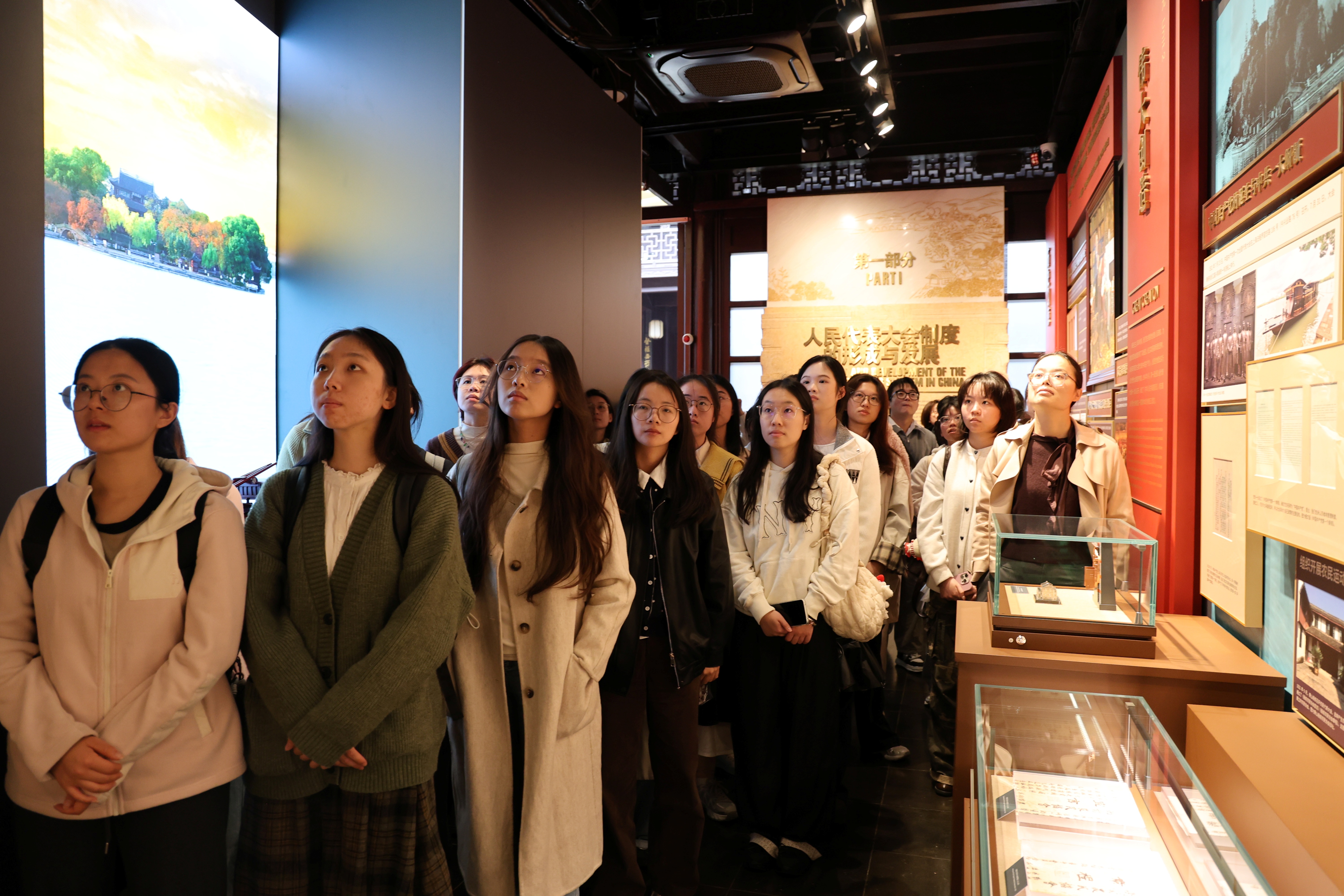 走进杭州市全过程人民民主实践中心,首先映入眼帘的是一尊题为《权力属于人民》的雕塑。“中华人民共和国的一切权力属于人民”16个大字在光线下熠熠生辉。同学们跟随讲解员的引导穿梭于各展区,聆听人民代表大会制度在杭州的落地与生长。从解放区“豆选”的历史渊源,到杭州立法工作的“N个第一”,制度的生命力在岁月流转中愈发蓬勃。
